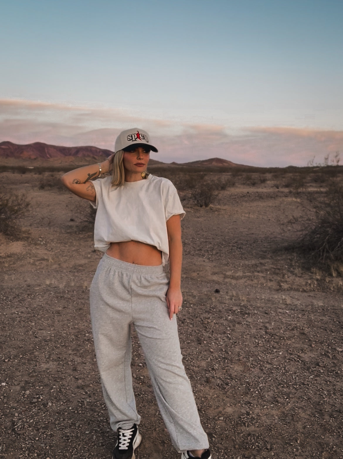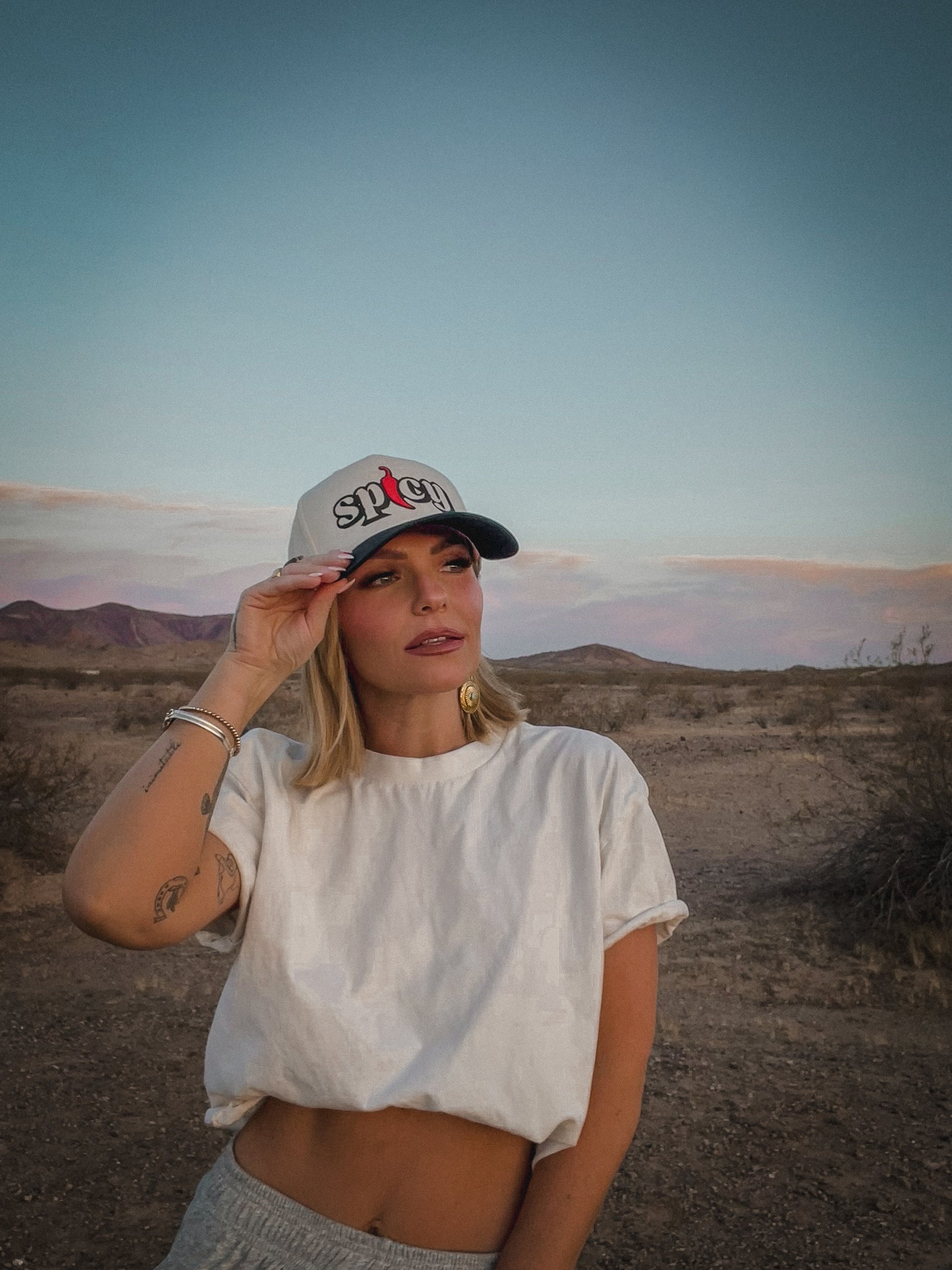 Embroidered “SPICY” SnapBack hat in black/cream.